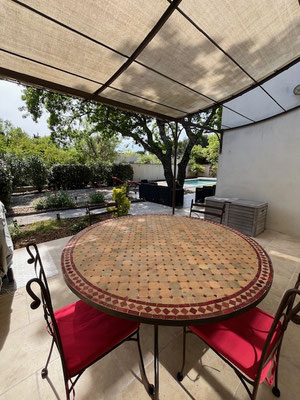 Un coin repas sous la tonnelle est idéal pour déguster vos plats cuisinés à la plancha.