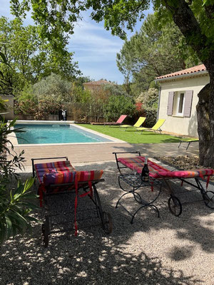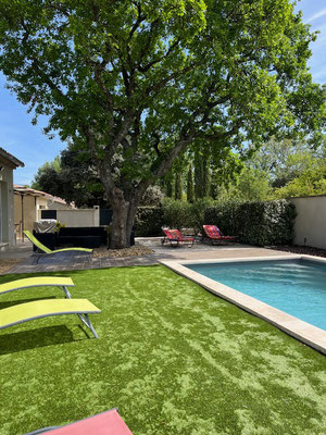 A l'ombre d'un chêne majestueux, le salon de jardin vous attend pour une pause lecture ou une sieste bien appréciée.